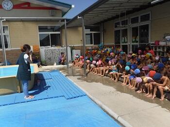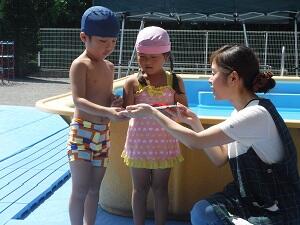 プールの神様にお礼をして、園長先生からがんばり賞の賞状をいただきました。