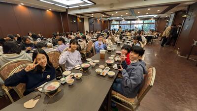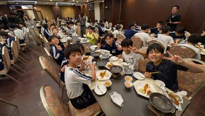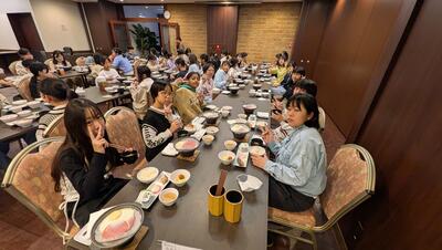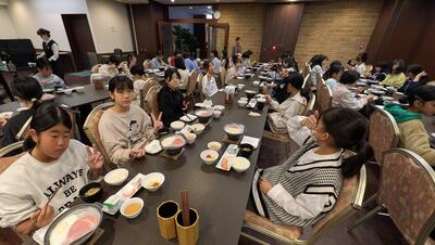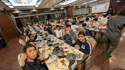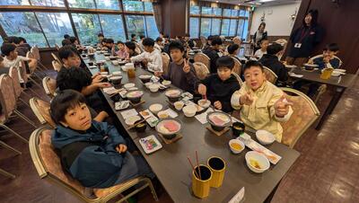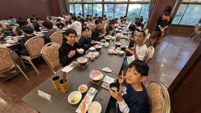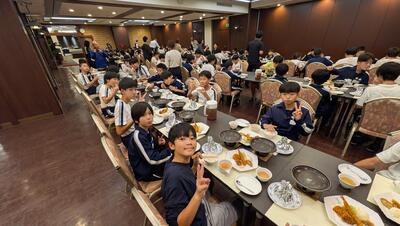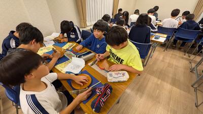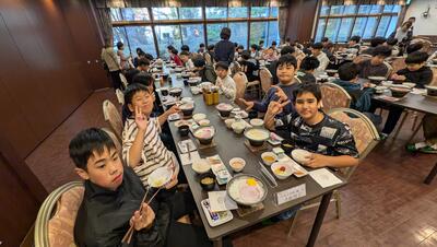 部屋の片付けを終えて、朝食です。朝の健康観察では、皆さん元気に二日目の朝を迎えました。