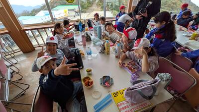 山頂に到着しました。全員元気です。待ちに待ったお弁当です。