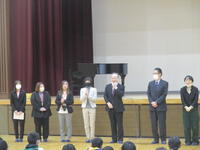 3月の全校朝会は全学年が一堂に集まる最後の会となるため、最初に全校児童で2月の歌である「心の中にきらめいて」を歌いました。