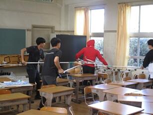 児童の安全を最優先に、侵入を学校全体に知らせ、さらに警察が到着するまで侵入者の動きを止めるという、なかなか難しい訓練です。これまで、野田警察署の署員の方から事前の講習を受け、さらにこの後、本日の訓練を振り返って改善点等を指導していただきます。安全な学校づくりのために、今後も研修を重ねてまります。