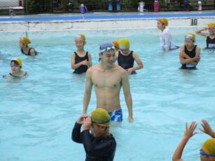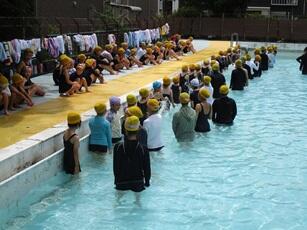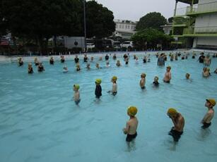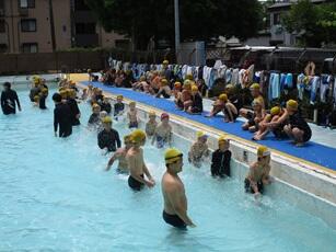 1年生が初めて中央小学校のプールに入りました。初回ということで、6年生も一緒にサポートのために入ってくれました。6年生が優しく手を差し伸べてくれたので、1年生は安心して水の中に入ることができたようです。
