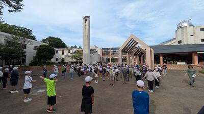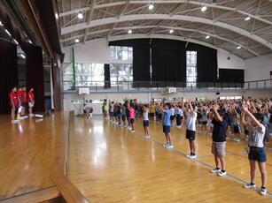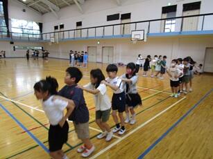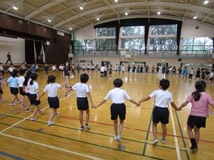 27日から林間学校へ出かける5年生、体育館でフォークダンスの練習を頑張っていました。予報が変わって週末は雨の心配はないようです。