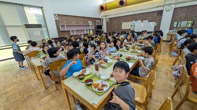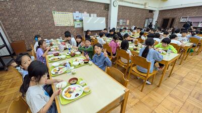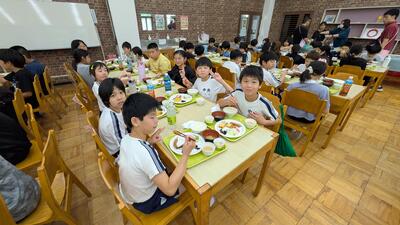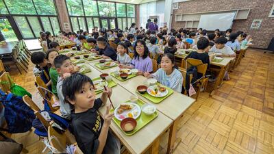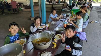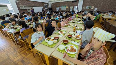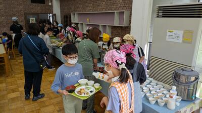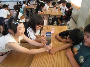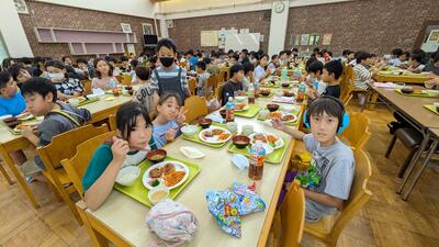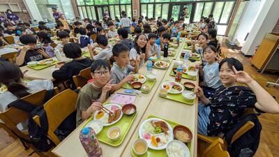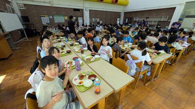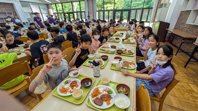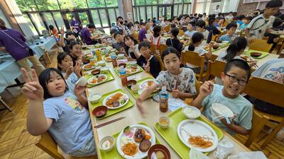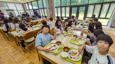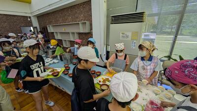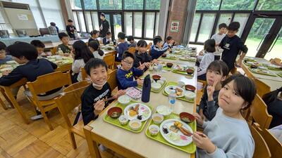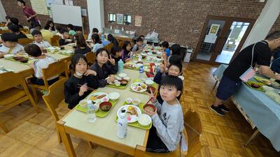 お昼ご飯です。みんなで協力して準備をしました。残さず食べましょうね。