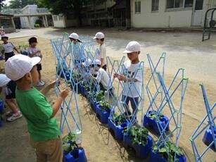 1年生が育てている朝顔が、元気に育っています。今日は、それぞれの植木鉢に支柱を立てていました。