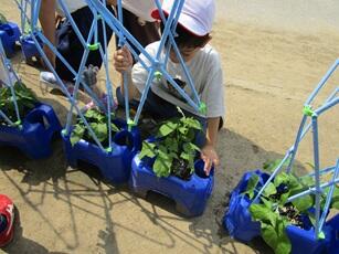 キュウリやナス、ミニトマトなど、自分で選んだ野菜の苗を植木鉢に植えていきます。