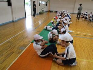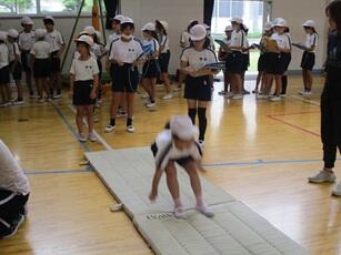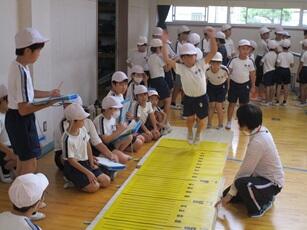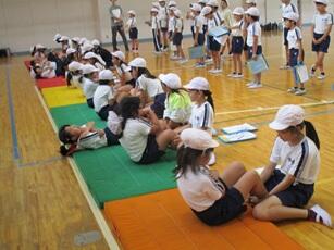 2年生が、5年生のお兄さんやお姉さんと一緒に「体力テスト」を行いました。1年生の時と比べて一回りも二回りも大きくなった2年生。どれだけ記録が伸びたか楽しみですね。