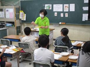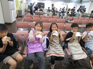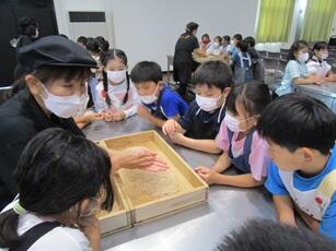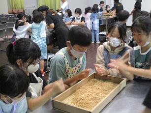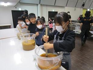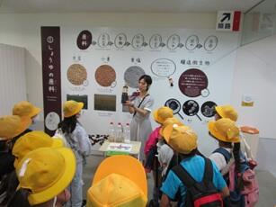「しょうゆづくり体験」では、材料に触れた後、「こうじ」を盛り込む作業や圧搾などを体験しました。最後にはおせんべいにしょうゆを塗って、しょうゆの味を楽しみました。「工場見学」では、しょうゆができるまでの行程をわかりやすく説明していただきました。