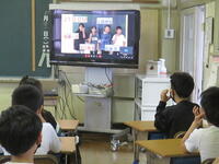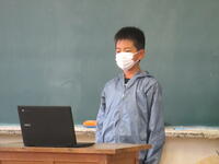 感染防止のため選手と児童会役員がいる教室と各学級をオンラインでつなぎ実施しました。