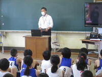 感染防止のため選手と児童会役員がいる教室と各学級をオンラインでつなぎ実施しました。