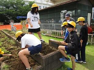2年生が野菜の苗植えを体育館で行いました。張替園芸さんにお金を渡して苗を購入し、植木鉢にお気に入りの野菜の苗を植えました。大きく育つといいですね。