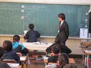 教育実習を行っていたもう一人の実習生が、本実習のまとめの授業を行いました。約1ヶ月間、一緒に過ごした5年2組の皆さんと、分母の違う分数の引き算はどのように計算すればよいのかを考えました。