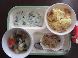 今日は、「のだの恵を味わう給食の日」で、市内飲食店「イチゼン」の飯森さんが考えた市内統一献立でした。黒酢米・ほうれん草・にんじんなどの、野田の恵みの食材を使ったメニューで、「カレー粉ライス・ホタテ入りクリームソース・鶏肉の香草パン焼き~シューブレゼ添え~・ガルビュール・牛乳」といったおしゃれでおいしい給食でした。