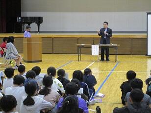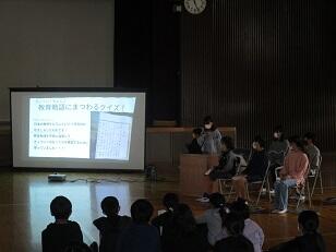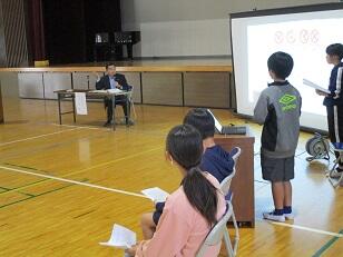 まず、中央小学校の卒業生である市長に、中央小の歴史に関する発表をクイズを交えて行いました。