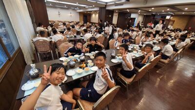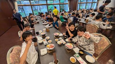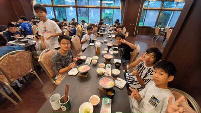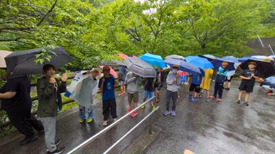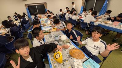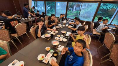 朝から本降りの雨となりました。この後の行動は、天気の様子を見ながら進めていきます。部屋の片付けをして、朝食です。朝の健康観察では皆さん元気です。