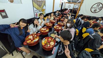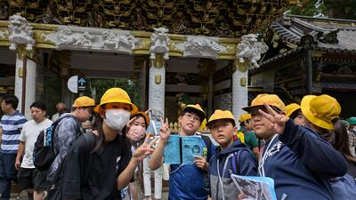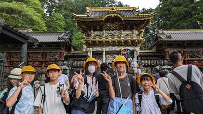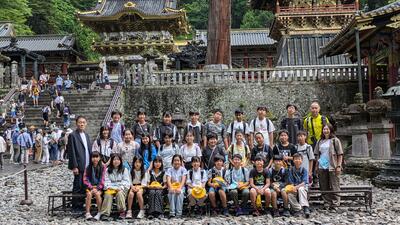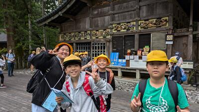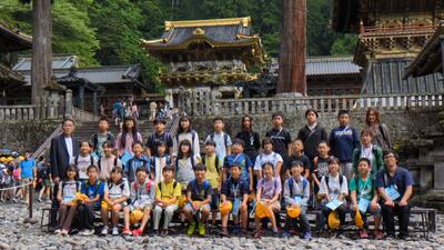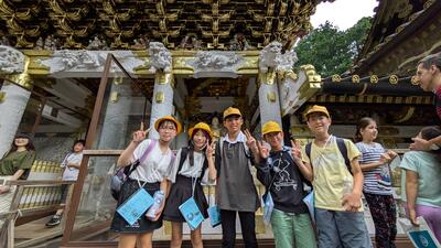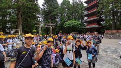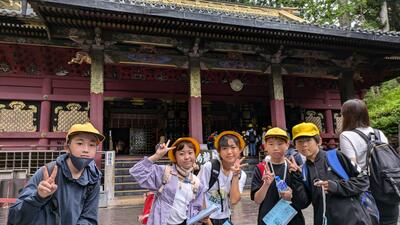 班ごとに、東照宮内の歴史遺産を次々と見学しています。ただ見学するだけでなく、班の中で自分が担当した歴史遺産をメンバーにガイドするなど、しっかり学習しています。