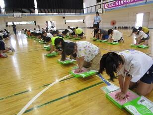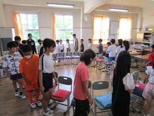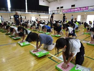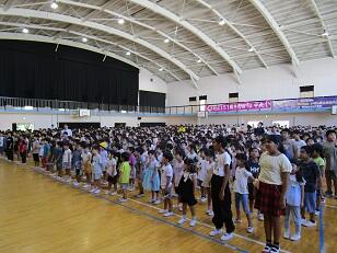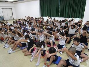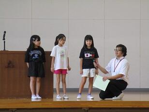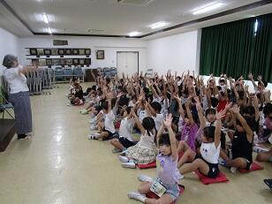 今月の歌は「夏の日の贈り物」です。高学年の美しいハーモニーが、体育館に響きました。