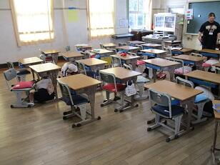 「ワンポイント避難訓練」を行いました。緊急地震速報を聞いて、速やかに一次避難(自分の身を守る行動)を行う訓練です。今後も繰り返し訓練を行う予定です。