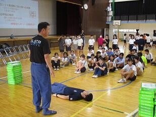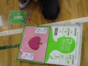 心肺蘇生トレーニングボックスを使って「胸骨圧迫」の練習をしました。『強く(約5㎝(単3電池一個分)押す)・速く(100~120/分)・絶え間なく』がポイントです。救急車要請から救急車の現場到着の平均時間が9分間、圧迫を続けなければなりません。