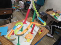 ビー玉を転がしながら、坂の傾きを確認したり、スムーズに曲がれるようにつなぎ目を調整したりしていました。