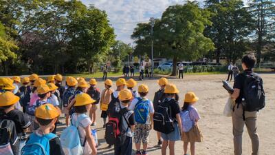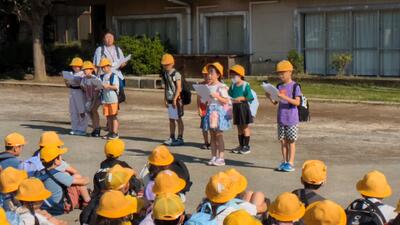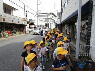 1年生が「まち探検」に出かけました。学校を出発して消防署を回り、商店街を通って、キッコーマン本社ビルわきで休憩した後、茂木佐公園に到着しました。新しい発見はありましたか?