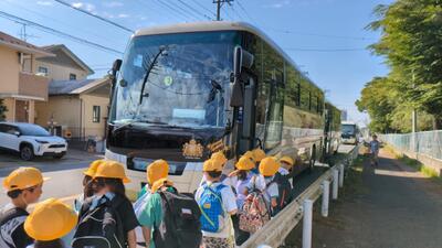 2年生が「船橋アンデルセン公園」へ校外学習に出かけます。雲一つない青空が広がり、気温が高くなることが予想されます。適切に水分補給を行い、熱中症には十分注意いたします。お見送りありがとうございました。