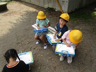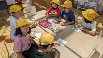 朝からきれいな青空が広がりました。お部屋の片付けを終えて、朝のつどいを行いました。皆さん眠そうですが、元気です。