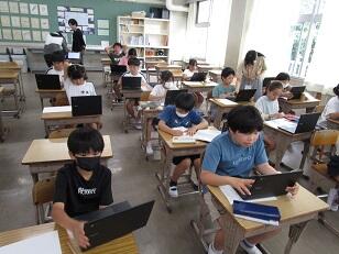 活動後は、手洗いや汗の始末をして、冷房のきいた教室で5時間目の学習に取り組んでいました。