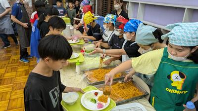お昼ご飯です。みんなで力を合わせて準備をして、美味しくいただきます。