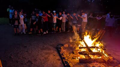 雨が上がり、キャンプファイヤーを行うことができました。元気に歌い、踊り、遊んで、楽しいひと時を過ごしました。多くの先生方が、遊びに来てくれました。