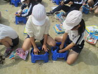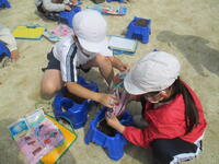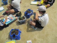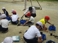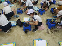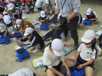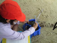 水を抜いたプールに、たくさんのヤゴがいます。2年生の学習でも活用するため、ヤゴを水槽に移しました。