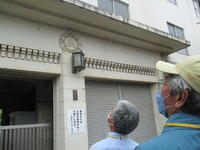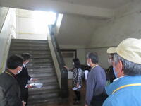 次に、昭和3年と7年に建てられ現存する3年館と7年館を見学しました。7年館の階段は末端でカールした階段手摺の装飾が、とても凝ったデザインとなっています。校舎の正面玄関上にはデンティル(歯形装飾)が施され、その中心に校章を配した装飾が施されています。