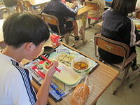給食センターの栄養士と野田市教育委員会の職員が給食の様子を見に来られました。