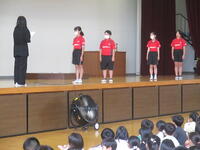 令和5年7月3日(月)、全校朝会に続いて、自転車部を励ます会を行いました。