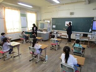 若年層の職員研修のため、市内の他の小学校の先生が、3年生と4年生の学級で研修を行いました。