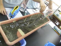 川に水を流し、カーブしているところの川岸の様子や川の上流、中流、下流の様子を確認しています。