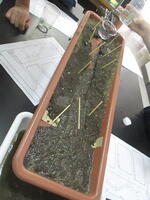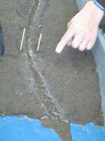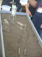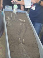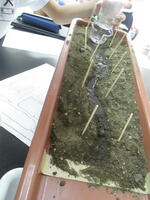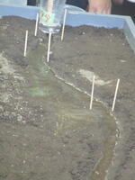川に水を流し、カーブしているところの川岸の様子や川の上流、中流、下流の様子を確認しています。