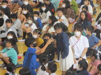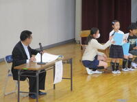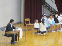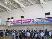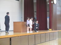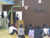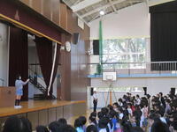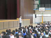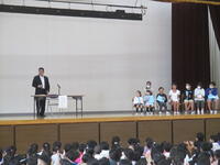 今週、今井教頭先生と3年館の歴史について調べました。3年館は95年目、7年館は91年目を迎えますが、昭和3年からの卒業生は3万2千人もいます。昭和20年前後は、全校で4千人以上の児童がいて、多い時で、毎年この体育館に集まっているお友達の数の卒業生がいました。そして社会に出て活躍をしています。このような歴史のある校舎で学べる学校は、全国に10校はないと思われます。皆さんが校舎を掃除してくれたり、新しいものから歴史のある古いものまで大切に使ってくれたおかげです。これからもよろしくお願いします。終わります。」