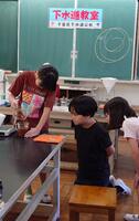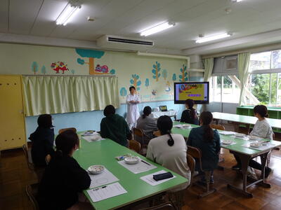 保健室の先生の説明をよくきいて、ていねいに手を洗う大切さと正しい洗い方を学びました。