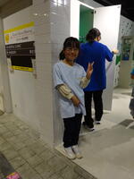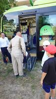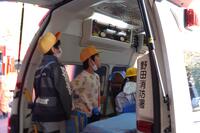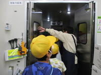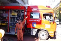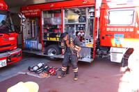 救急車には順番に乗せていただきました。消防車(正確には「水槽付消防ポンプ車」)の説明、そして出動の際の準備の様子を実際に見せていただき、その早さにびっくり!