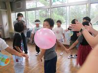 体育館で、バナナ鬼と手つなぎ風船バレーを行いました。