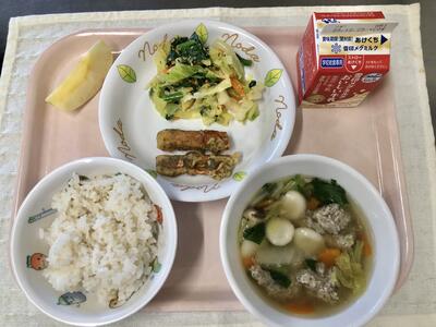 ☆きょうは、しらたまだんごとごま入りの肉団子が入った「だんごまぞうに」です。肉団子には、レンコンも入