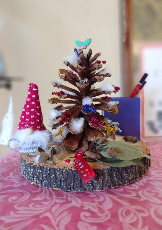 今月は、クリスマスをイメージした作品。とってもかわいいです。学校のマツボックリ(巨大)を使ったそうです。