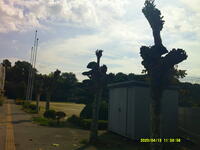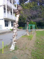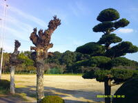 また、1年生教室前に2本、職員駐車場前に4本プラタナス(たぶん)の木があります。こちらも、先週あたりからボチボチ葉が落ち始めました。薄く大きな葉なので、朝露や雨に濡れると竹ぼうきでもうまく掃くことができず、きれいにするのに大変な労力を要します。そこで、こちらは枝打ちをして完全に丸坊主状態にしました。それにしても植物の生命力はすごい!去年も丸坊主にしたのに、1年でしっかり復活するとは…木・金・土と小分けにして作業を進め、先ほど無事作業が完了しました。次は、2週間後くらい?から、イチョウの枝打ち作業かな。
