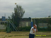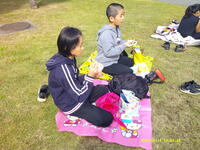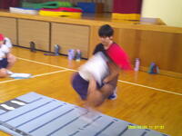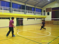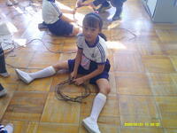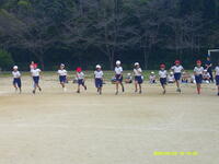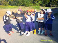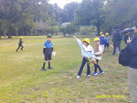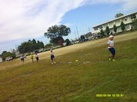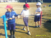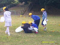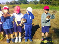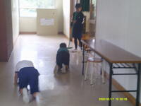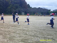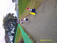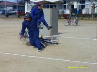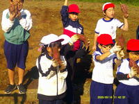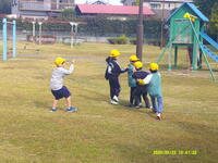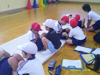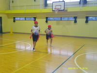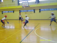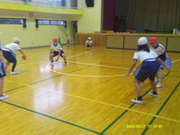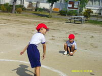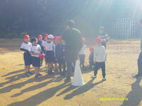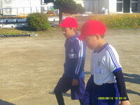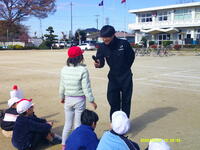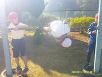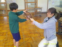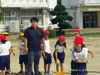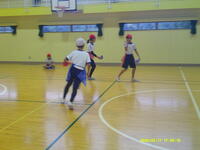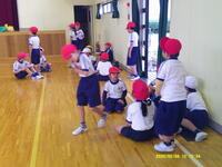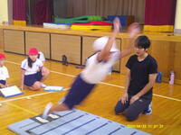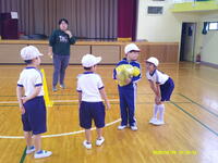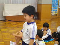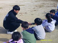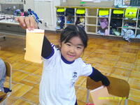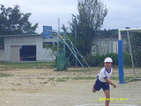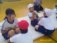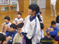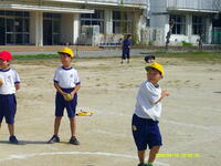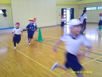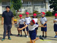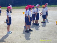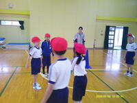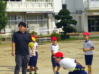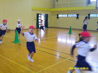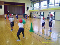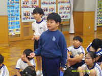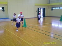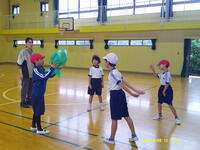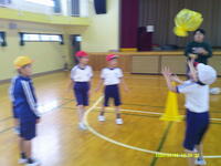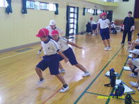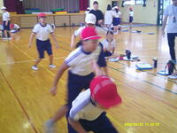 持久走の後は、ビニール袋に新聞紙をつめたものをボール代わりに「ボンバーゲーム」というゲームを行っていました。「相手方から投げられたボールを落とさないようにキャッチし、チームの味方全員に順番にパスして、最後にキャッチした子が相手コートに投げる。ボールは爆弾!?代わりですから、落としてしまったらOut!!」というゲームです。得意・不得意なく全員がキャッチできるのですが、それでも「ミスなく続ける」ということは、1・2年生には難しいようで、ゲームとしてきちんと成立していました。ボールを変えたり、制約を加えたりすれば、中・高学年でもゲームとして成立しそうです。楽しそうに体を動かす姿が、印象に残りました。