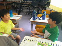 2年生が音楽で、「かぼちゃ」という楽曲のリズム打ちに挑戦していました。ペアで、3~4人のグループで、全員で…と人数を変えながら取り組んでいましたが、やはりみんなで上手く合わせられると嬉しいようです。笑顔がとても素敵な音楽の時間でした。