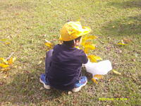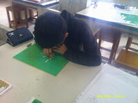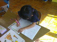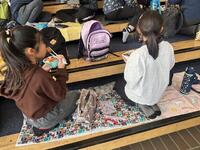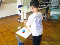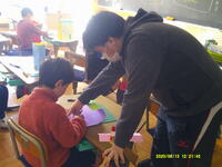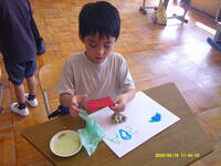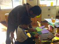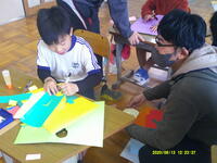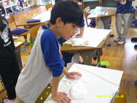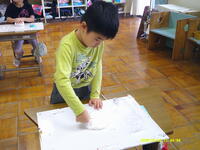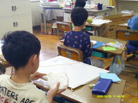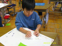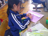 1年生は図工で、お花紙を使った作品(絵画に近い?)作りに挑戦していました。様々な色のお花紙を、ちぎったり、くしゃくしゃにしたり、ちぎったり、丸めたりしながら、紙に貼りつけ作品を作っていきます。
