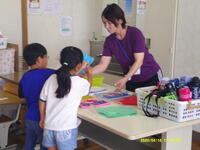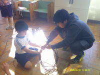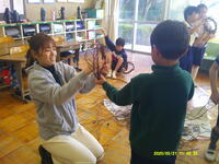 クリスマスにまつわる絵カードの裏に一枚だけ一億円!のお年玉が貼ってあるという設定で(なぜ、お年玉!?)、描かれた絵の内容を英語で「Christmastree please」のようにして、当てるゲームです。これが、とにかくなかなか当たらないので、見ている方が大笑いしました。最後は、子どもたちがリクエストしたクリスマスの歌を楽しく歌いました。マルコ先生は英語での「Jingle bell」を準備していたのですが、子どもたちのリクエストは日本語での「あわてんぼうのサンタクロース」でした。