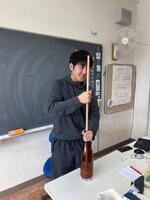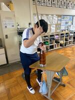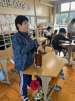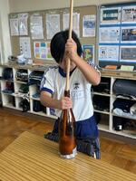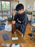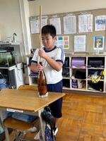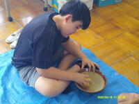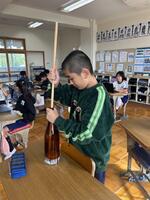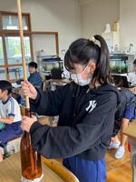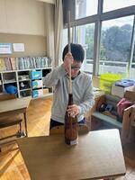 実際にやってみるとやはり難しいようで、子どもたちが「できた!!」と言って移した器の中には、まだ籾殻が完全に取れていないものもそれなりに混ざっていました。また、押しつける力が強すぎるとお米は割れてしまいます。今日もまた、昔の人たちの苦労を味わうことができました。籾摺りにはまだ時間がかかりそうですが、職員室には精米作業用の一升瓶と棒が待機しています。がんばれ!!