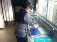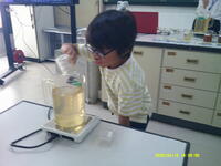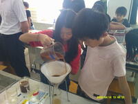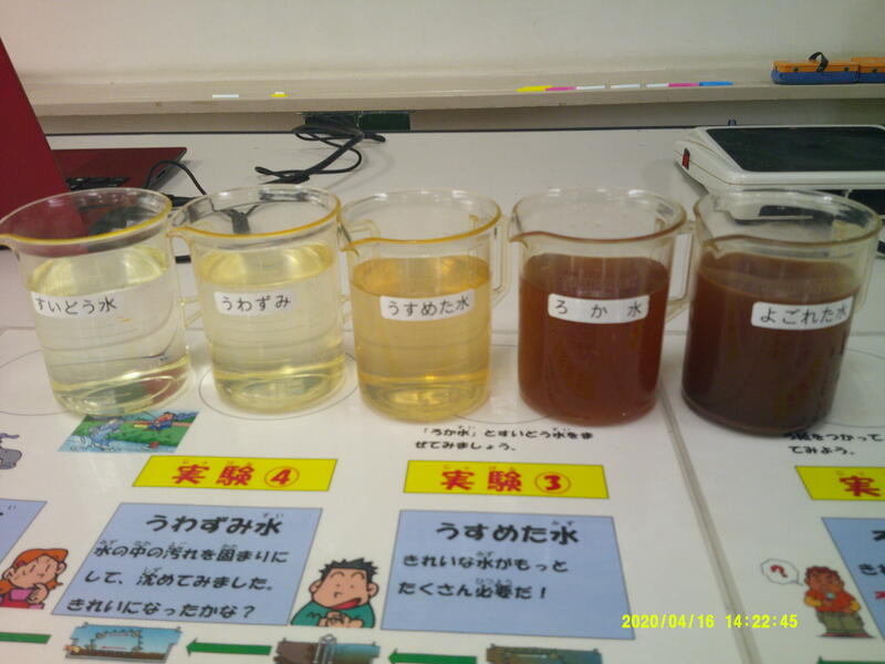 下水処理場の仕組みをモニター画面で説明を受けながら見た後、同様の手順で水をきれいにする実験をしました。①ココアパウダーを使って疑似汚水を作る。②汚水をろ過する③ろ過した汚水を薄める③薄めたものに薬品を入れ(実際には微生物の力を使います)汚れを分解し上澄みを取る④CODパックテストを使って、それぞれの段階の汚染度を確認する の順に進めました。CODとは「科学的酸素消費量」のことで、水の汚れ(有機物療)を色の変化で見ることができ、数値が大きい程汚れた水となります。